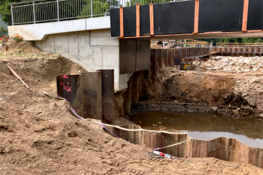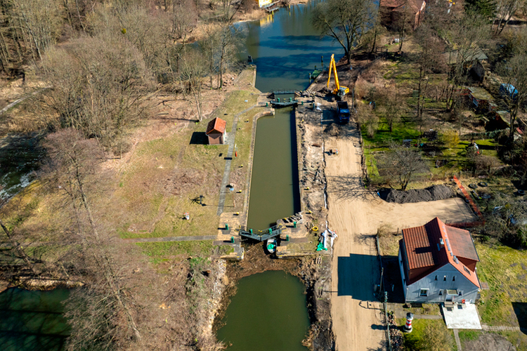 An der Schleuse Wolfswinkel führten Schwierigkeiten beim Errichten der bauzeitlichen Hochwasserführung zu einem verzögerten Start der Abbrucharbeiten. Nach dem Setzen der Spundwände ist der Abbruch der alten Schleuse nun bis rund zwei Meter unter Geländeoberkante erfolgt. Derzeit wird die Baugrube ausgesteift; im Anschluss wird der Abbruch weiter vorangetrieben – dann unter Wasser.