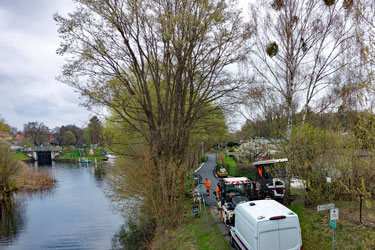 Der Abbruch neben und unterhalb der Brücke erfolgt unter ständiger Messung von Setzungen und daher gesondert zur Schleusenkammer. Das Luftbild zeigt anschaulich die links im Baufeld liegende Brücke, deren Straßenanschlüsse komplett zurückgebaut werden mussten. Der starke Baumaschineneinsatz erfordert ausreichend Bewegungsfreiraum, weshalb bauzeitlich hier auch keine Querung für öffentliche Verkehrsteilnehmer möglich ist.