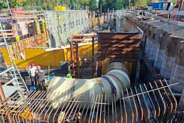 Neben dem Einbau der Bewehrung wurden auch schon erste Stahlwasserbauteile montiert, wie beispielsweise die Aufnahme der zukünftigen Schleusentore im Unterhaupt. Diese Stahlbauteile sind von entscheidender Bedeutung für die spätere Funktion der Schleuse, da sie die Basis für das sichere Schließen und Öffnen der Tore bilden werden.